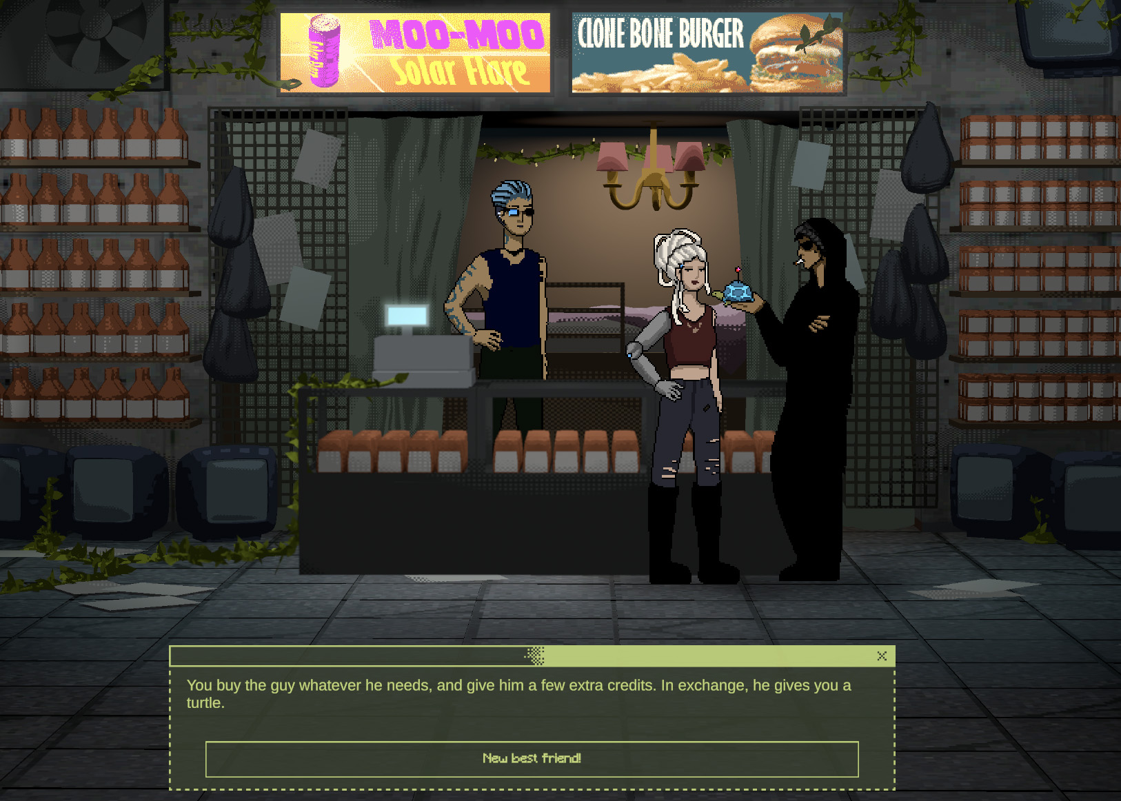 Colony Howl har inspireret spillets visuelle udtryk, farver og stemning. Den mørke og dystopiske atmosfære ligger tungt over kiosken, men brydes af absurde dilemmaer, overraskende let og humoristisk tone samt et miks af kulturelle og sproglige referencer. Alt sammen noget, der også kendetegner Freeman og Lowes værk.