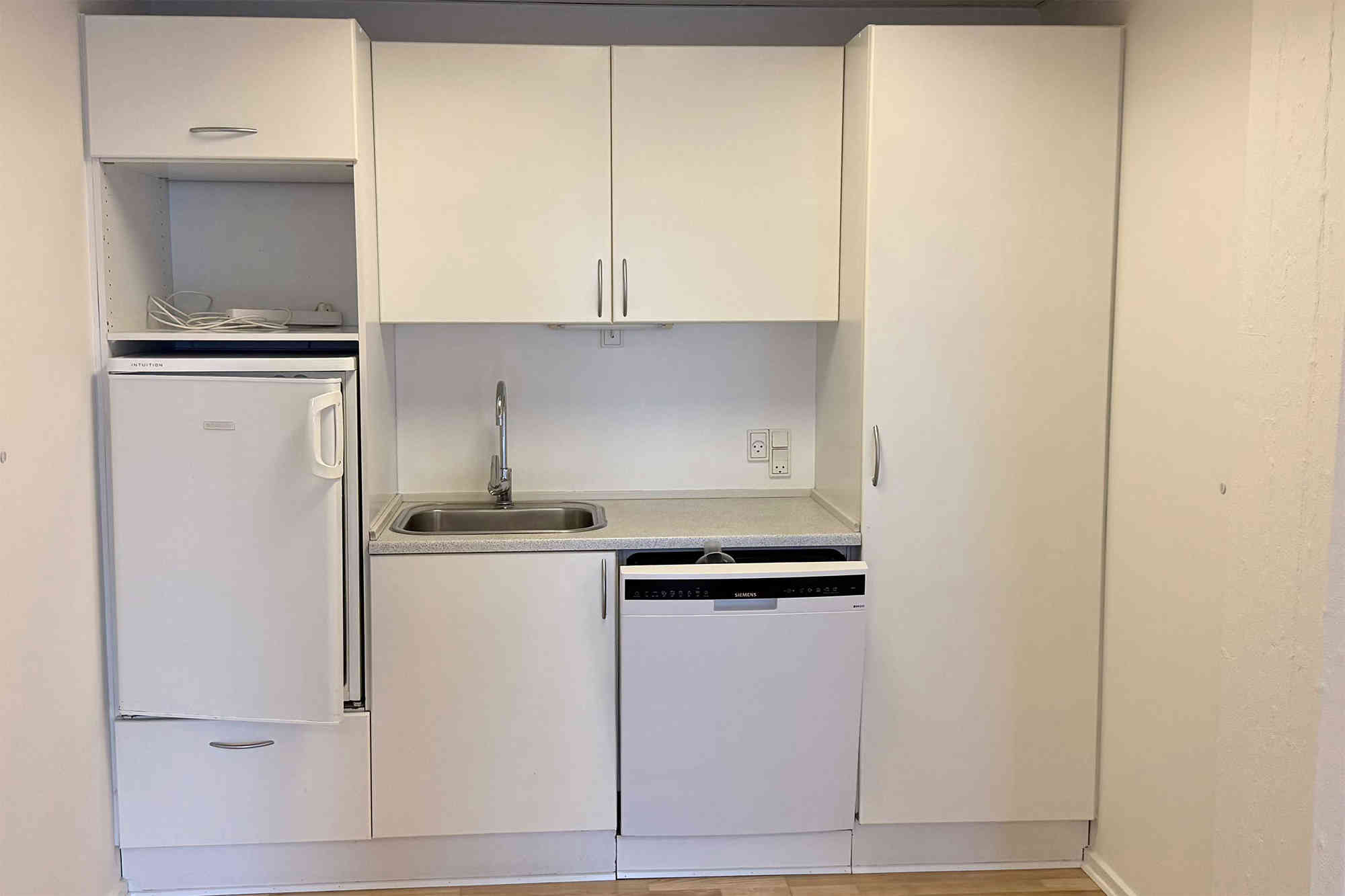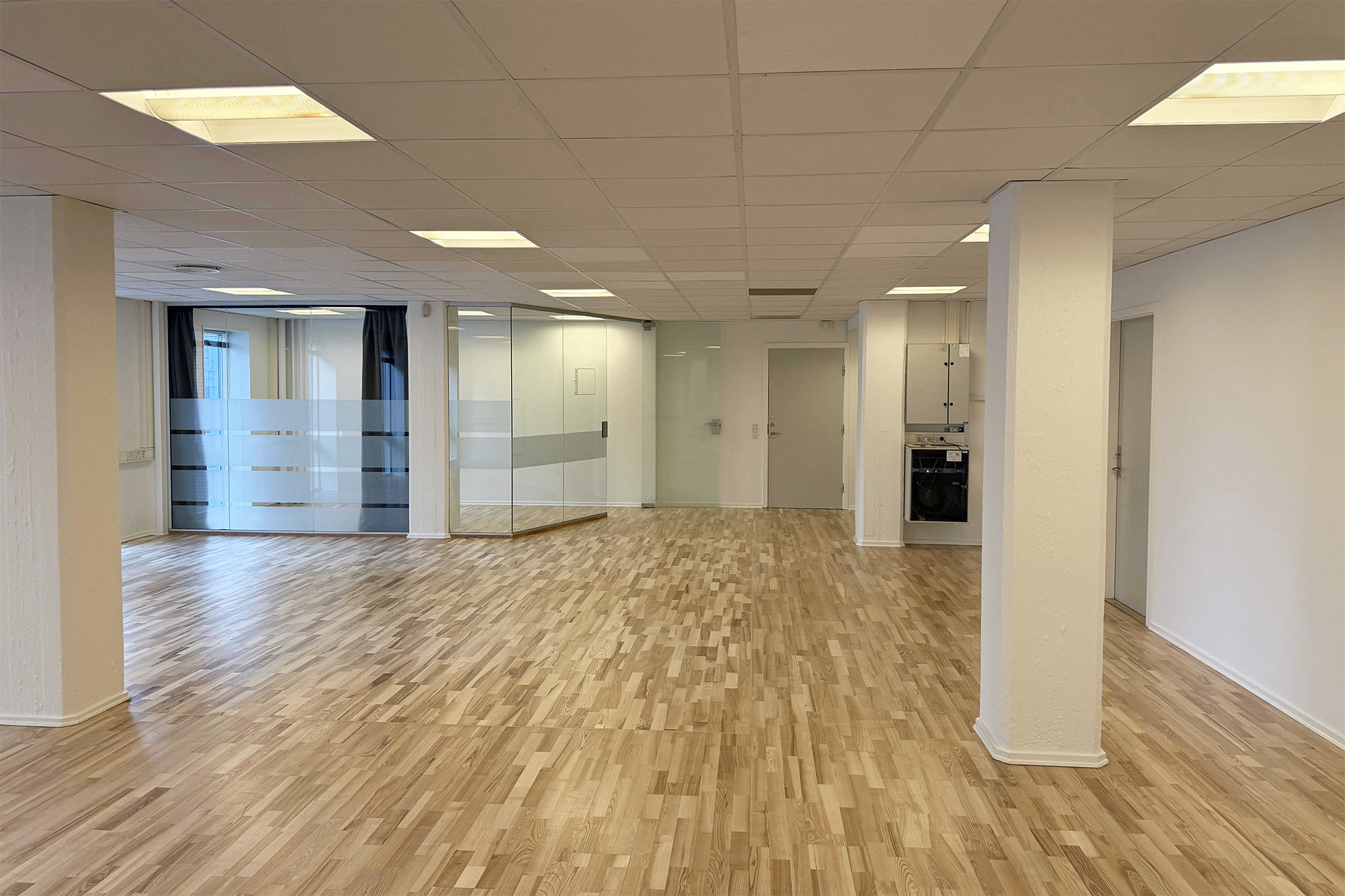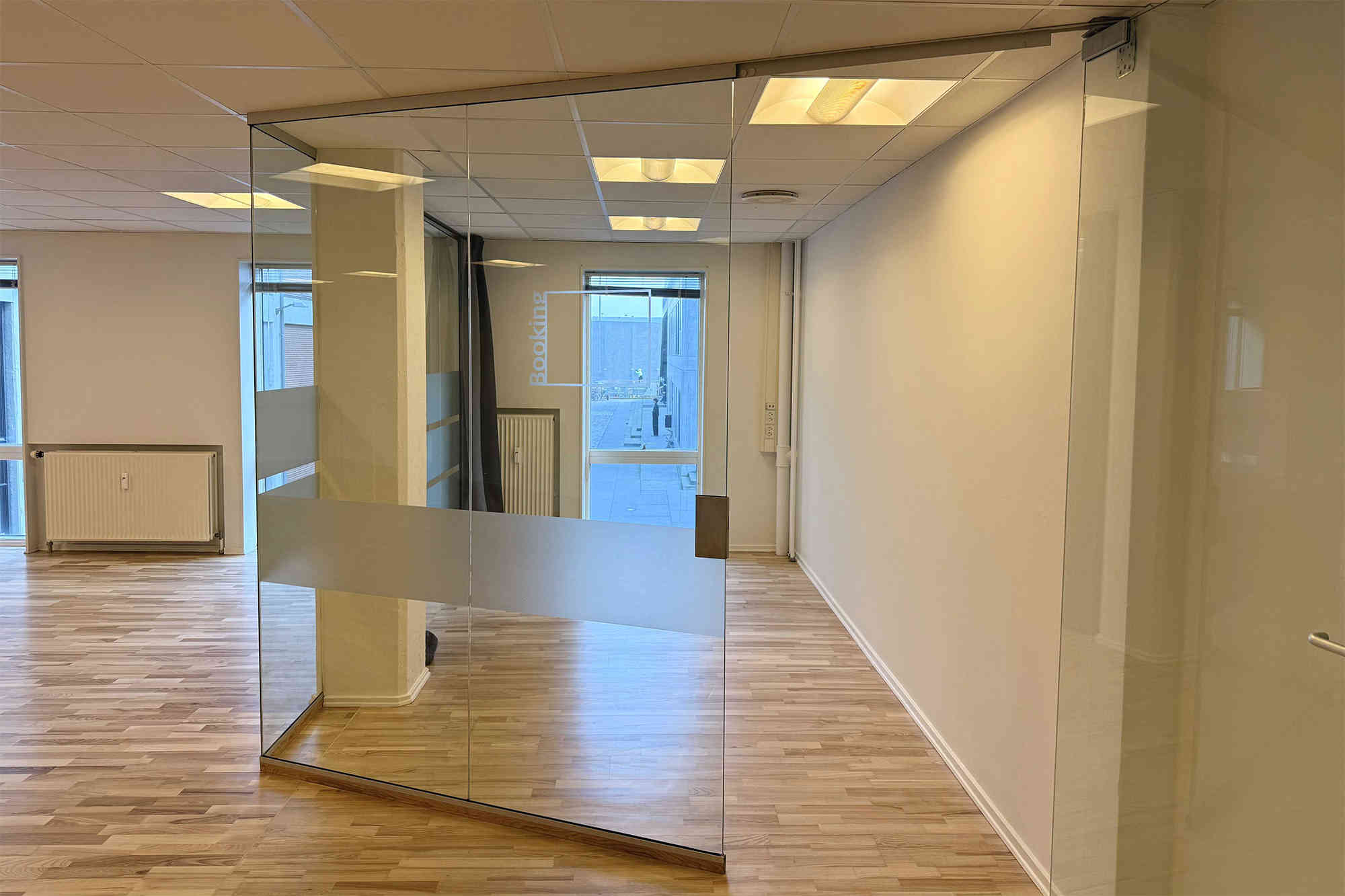 Lokalet er lyst og rummeligt med store vinduer mod gården, der sikrer et behageligt lys hele dagen. Indretningen er både funktionel og moderne med et afskærmet mødelokale bag glasvægge, som skaber ro til møder uden at lukke lyset ude. Lejemålet rummer desuden et tekøkken med opvaskemaskine og køleskab, så hverdagen bliver nem og effektiv.