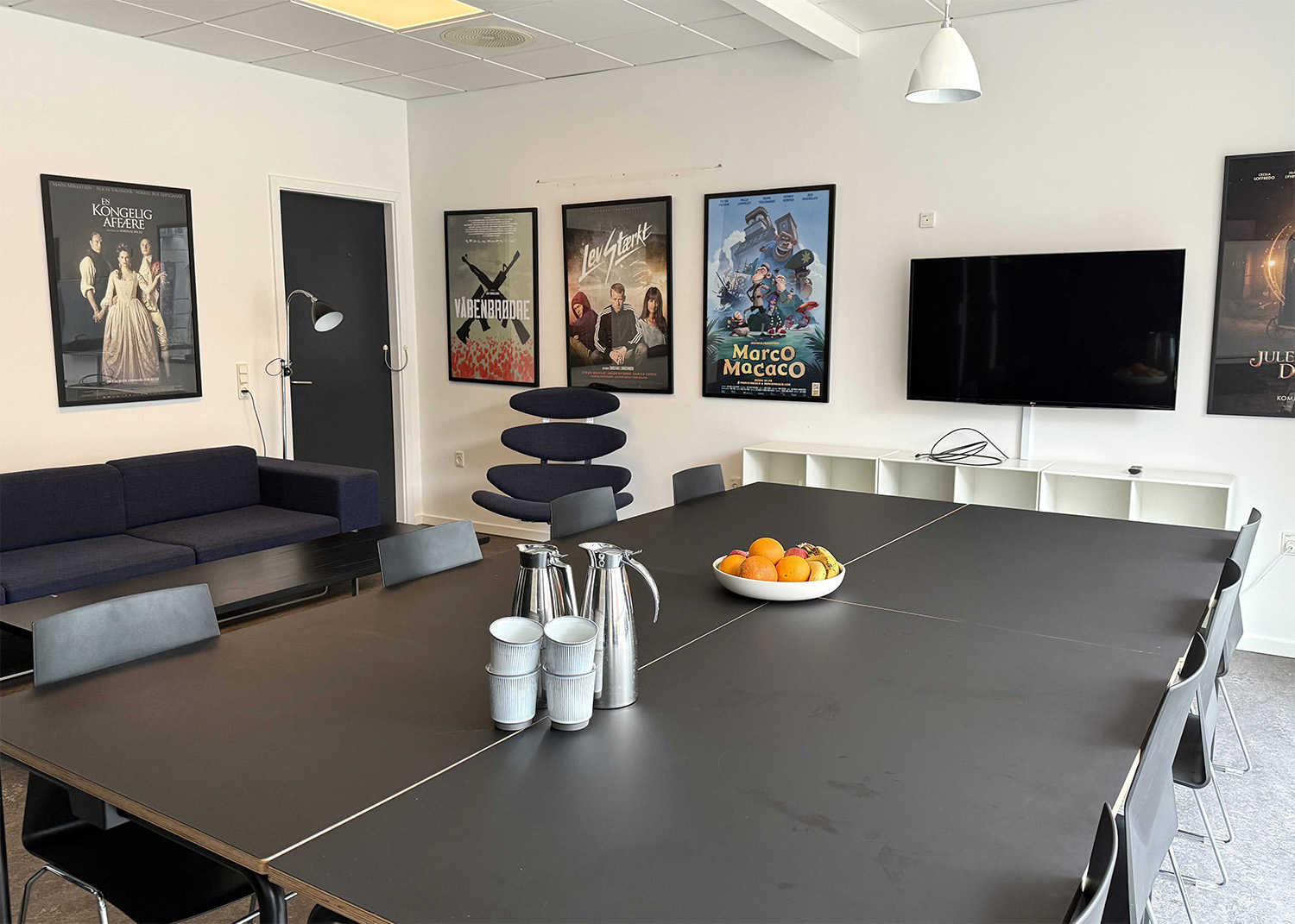 Hvis produktionen har brug for et godt kostumerum, eller hvis behovet er et mødelokale til otte personer, anbefaler vi Mødelokale 2. Her kan I arbejde ved det store møde- og arbejdsbord og tage en pause i sofaen. Der er også badefaciliteter, hvis der er behov for det imellem optagelser. Mødelokale 2 ligger med direkte adgang til Studie 1 og kan med fordel bookes sammen med Mødelokale 3 og Sminken, da de ligger på samme etage.