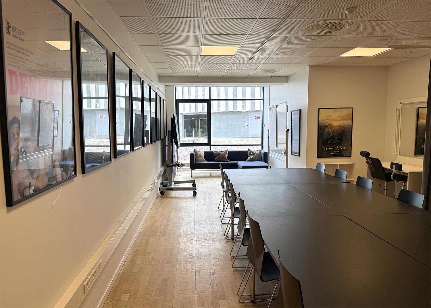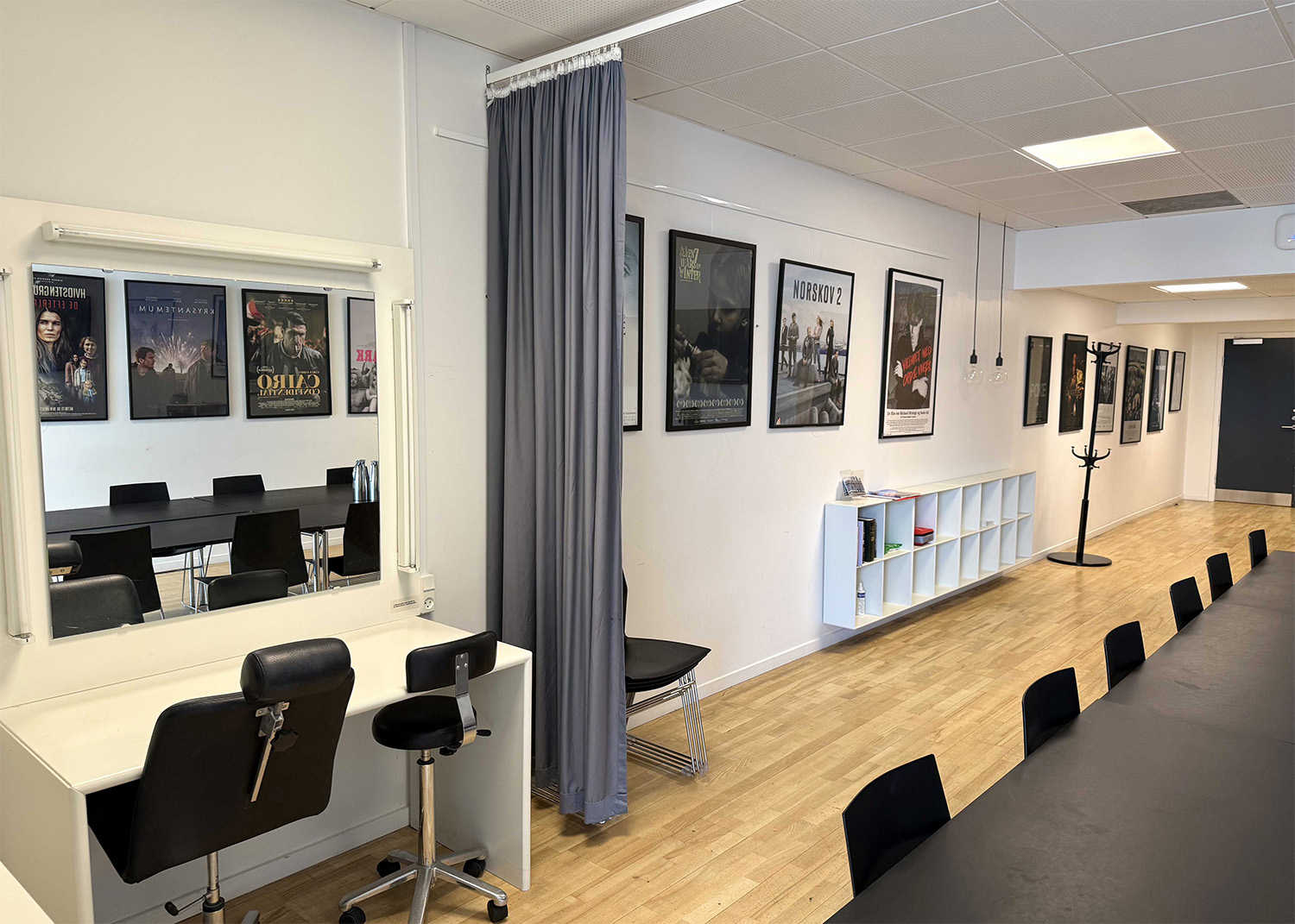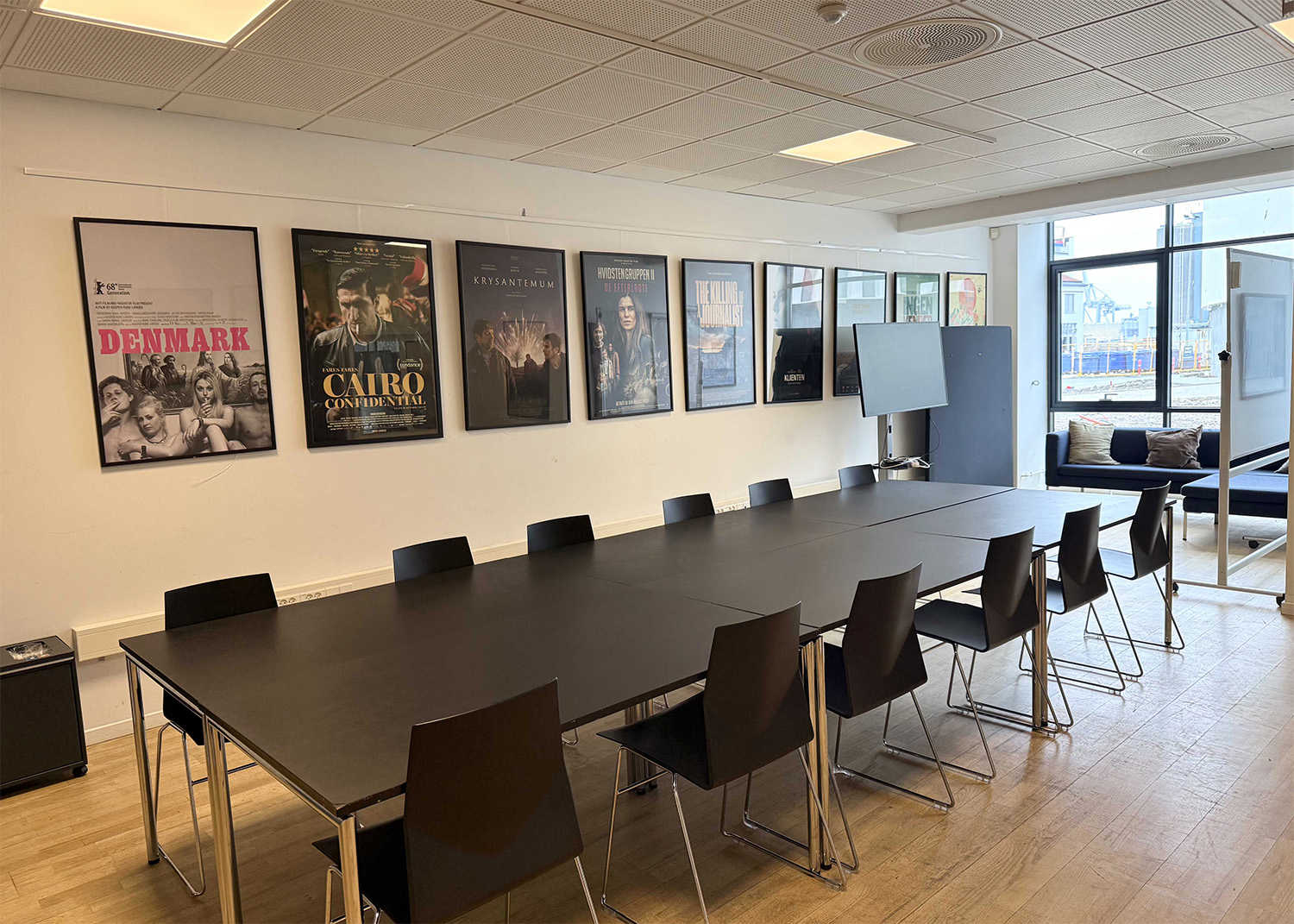 På samme gang som indgangen til Studie 2 finder I Mødelokale 5. Med det store mødebord samt sofa og sminkebord, er Mødelokale 5 et godt valg som frokost- og produktionskontor for den mindre produktion, f.eks. ved leje af Studie 2 eller som mødelokale for op til 12 personer. Lokalet er også velegnet til kurser, seminarer, foredrag, receptioner, m.m.