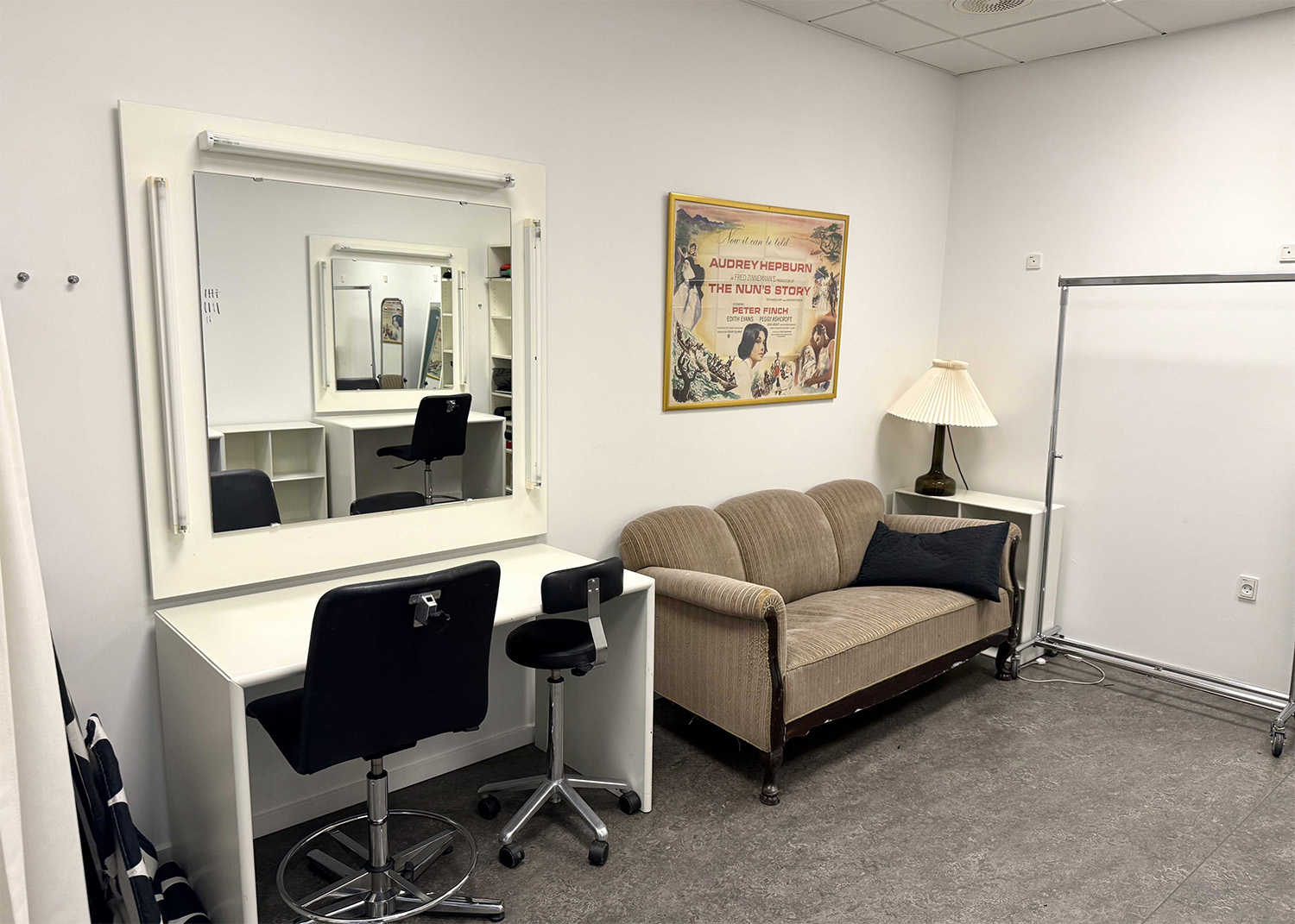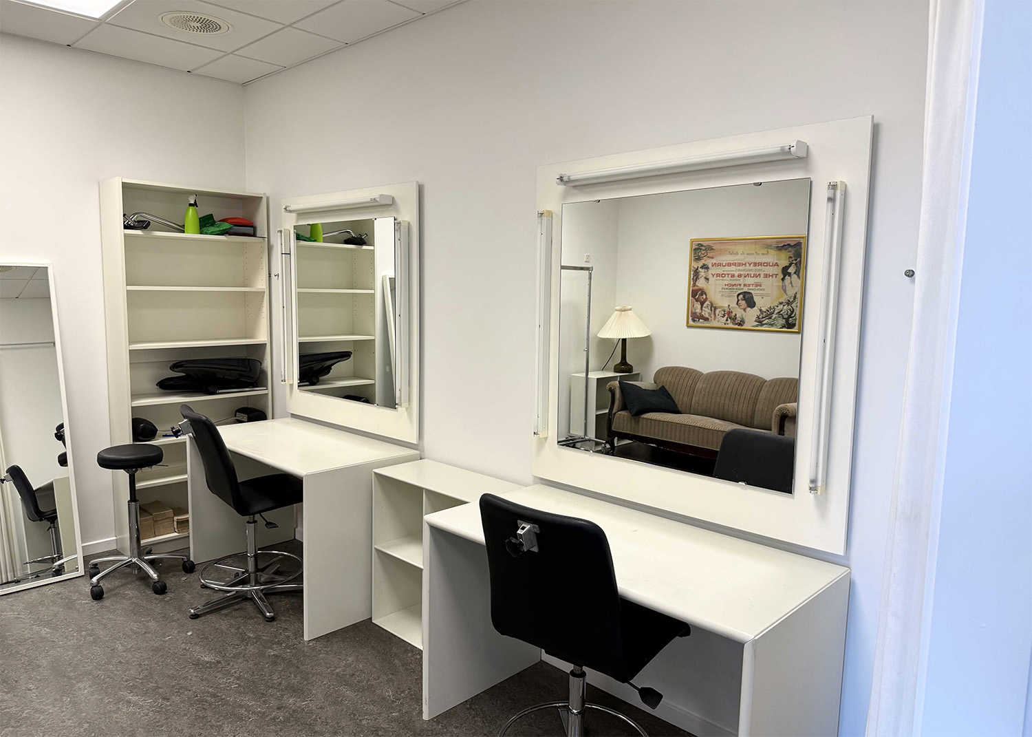 Har produktionen brug for et særskilt sminkerum, anbefaler vi Sminken, som ligger på sammen etage som Mødelokale 2 og Mødelokale 3 og har direkte adgang til Studie 1 via trappen.